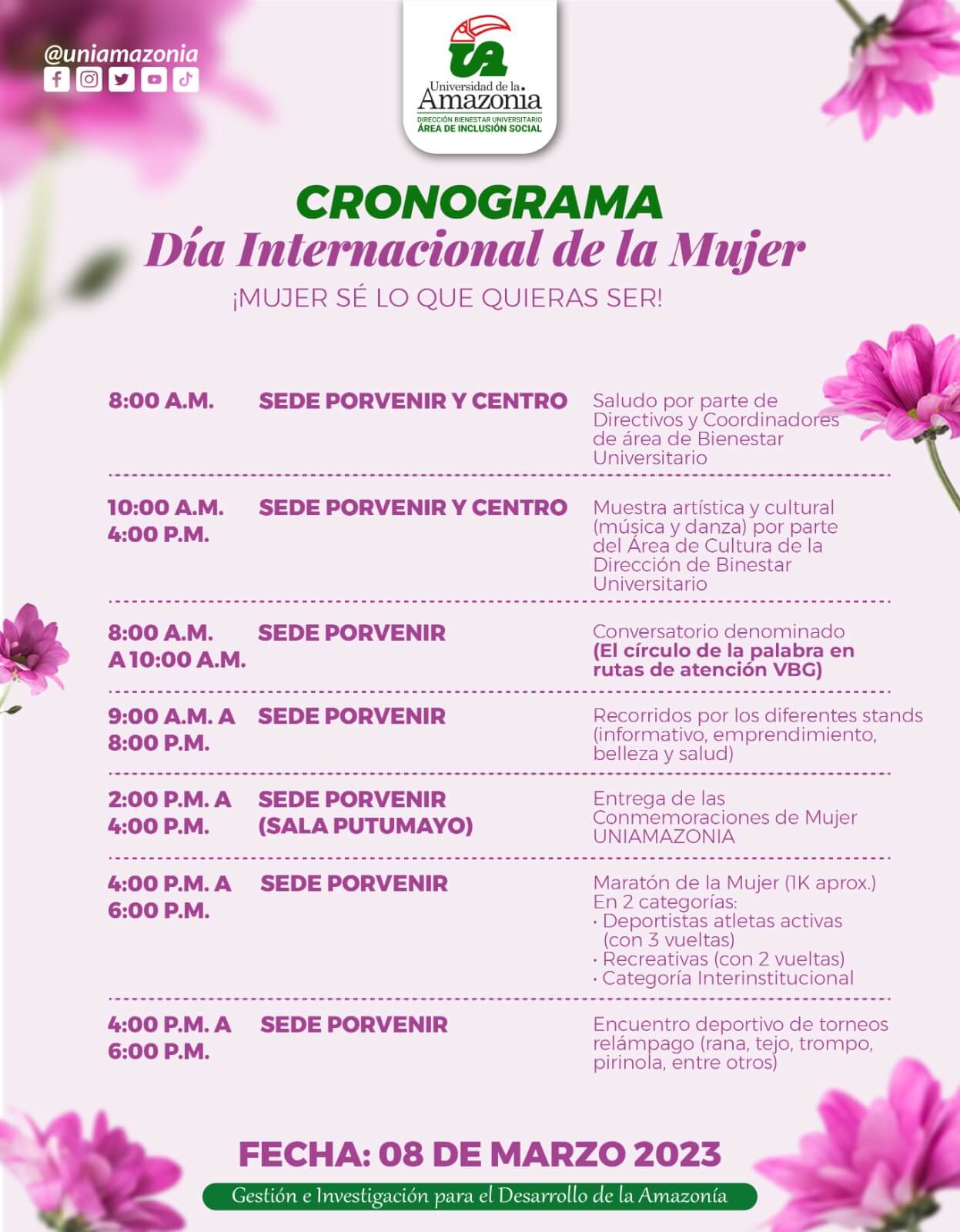 La Universidad de la Amazonia, desde la División de Bienestar Universitario y el Área de Inclusión Social hace extensiva la invitación a la comunidad universitaria a participar de la Conmemoración del Día Internacional de la Mujer.