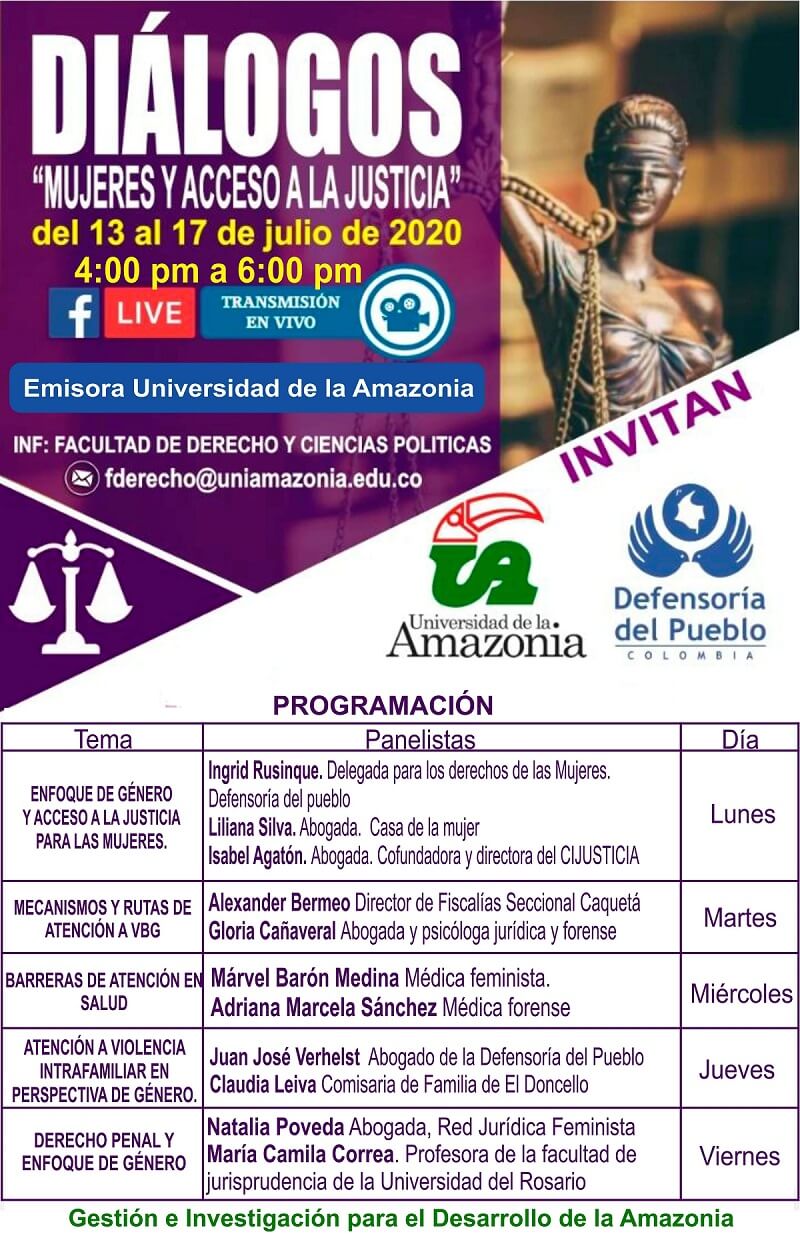 Invitamos cordialmente a la actividad "Diálogos: Mujeres y Acceso a la Justicia", que se realizará del 13 al 17 de julio a través de la Fan Page Emisora Universidad de la Amazonia. Invitan: Defensoría del Pueblo y Universidad de la Amazonia desde la Facultad de Derecho.