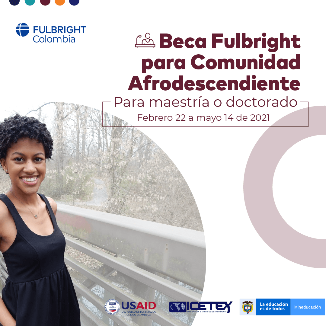 La Beca Fulbright para Comunidades Afrodescendientes responde a la necesidad de aumentar las oportunidades de acceso a la educación superior de calidad en las distintas regiones del país y entre distintos grupos poblacionales. Esta beca apoya la formación de alto nivel de hasta tres (3) profesionales colombianos pertenecientes a comunidades afrodescendientes que deseen realizar programas de maestría o doctorado en universidades de los Estados Unidos, a partir del segundo semestre del 2022.