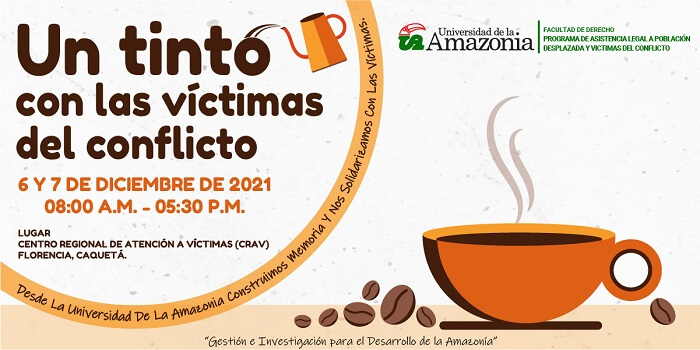 Si eres víctima de conflicto no estás solo, es por eso que queremos rendir un homenaje y escucharlos en nuestra actividad denominada “un tinto con las víctimas del conflicto”, a realizar este 6 y 7 de diciembre de 2021 de 8:00 am a 5:30 pm en las instalaciones del Centro Regional de Atención a Víctimas (CRAV) de la ciudad de Florencia, Caquetá.