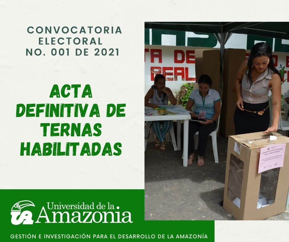 Florencia- Caquetá, siendo las once de la mañana (11:00 a.m.) hora legal colombiana del día veinticinco (25) de mayo de dos mil veintiuno (2021), en las instalaciones de la Universidad de la Amazonia, se procede a publicar el acta definitiva de las ternas habilitadas, correspondiente a la convocatoria electoral No. 01 de 2021, mediante la cual se elegirá al Representante del Sector Productivo ante el Consejo Superior Universitario.