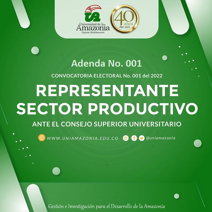 El Consejo Electoral de la Universidad de la Amazonia en reunión ordinaria realizada el día 30 de septiembre del 2022 mediante la adenda No. 001 del 2022 y la Circular No. 003 de 2022 se permite informar a la comunidad universitaria y demás interesados, la reanudación de la Convocatoria Electoral No. 001 de 2022 por la cual se convoca a los sectores Productivos reconocidos legalmente a la asamblea de elección de su Representante ante el Consejo Superior Universitario.