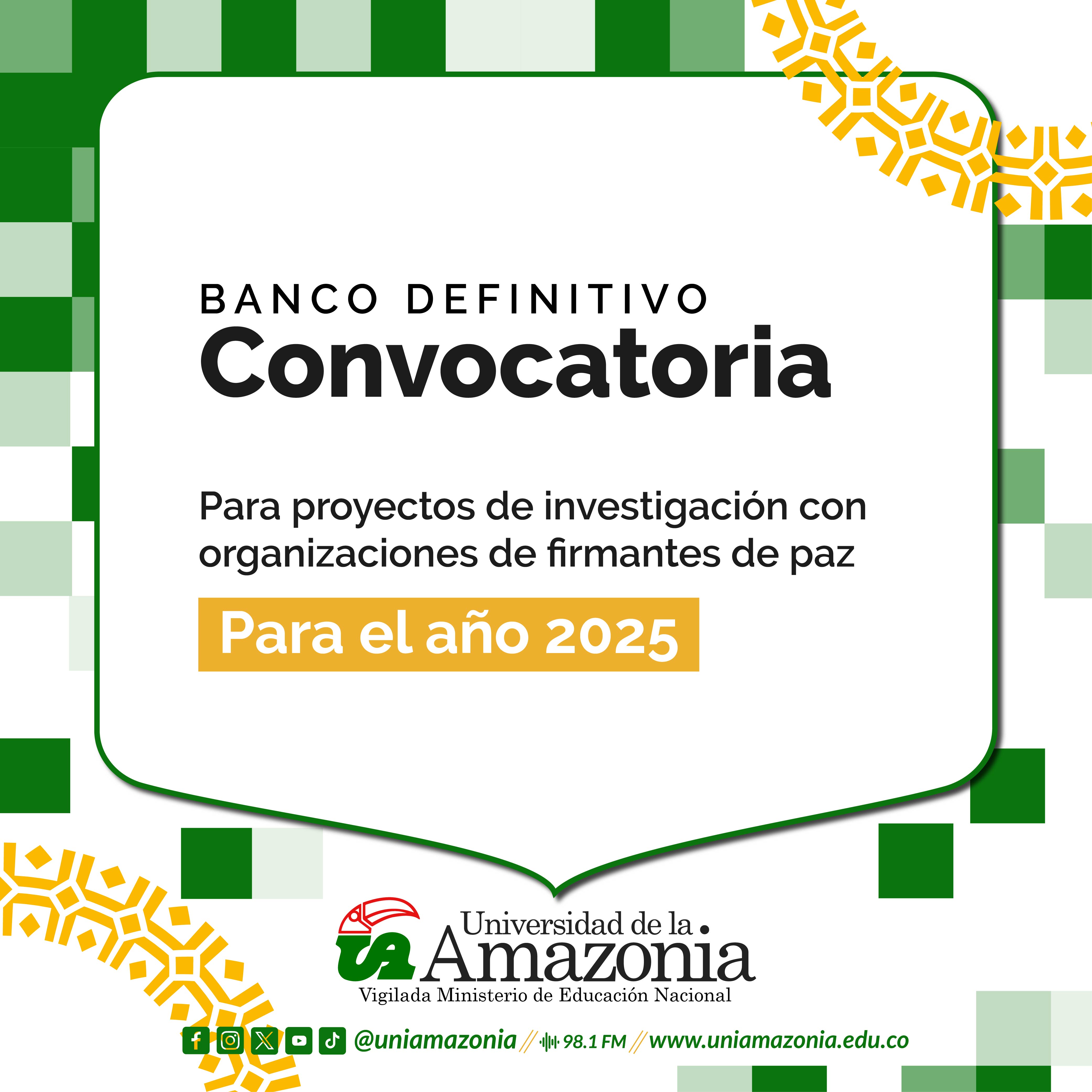 La Universidad de la Amazonia, a través de la Vicerrectoría de Investigaciones e Innovación da a conocer el banco Definitivo de la convocatoria para proyectos de investigación, en el marco del fortalecimiento de las iniciativas de construcción de paz, a través de alianzas con organizaciones de firmantes de los acuerdos de paz, en los antiguos espacios territoriales de capacitación y reincorporación (AETCR) del departamento del Caquetá, para el año 2025, reglamentada mediante la Resolución No. 0287 del 04 de febrero de 2025.