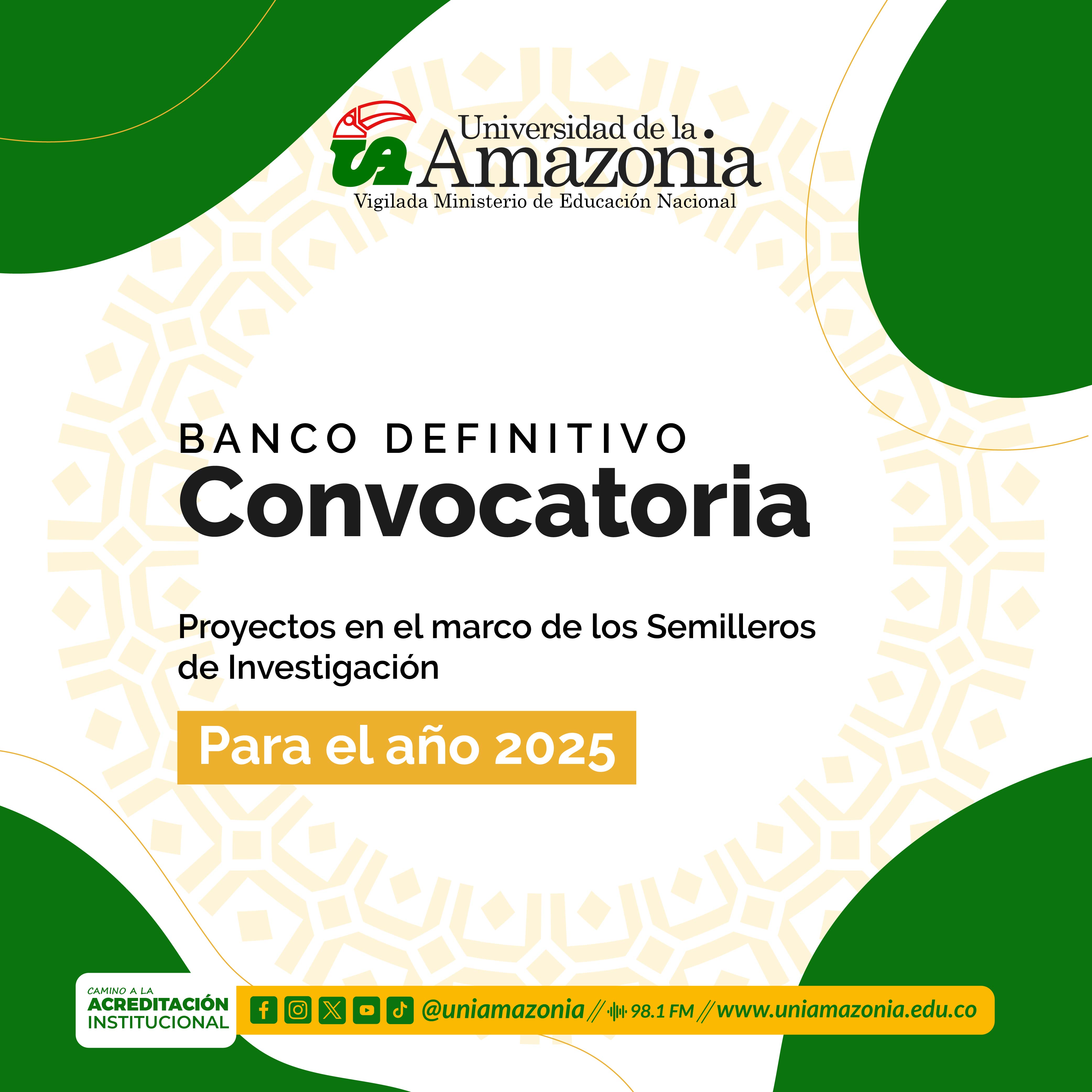 La Universidad de la Amazonia, a través de la Vicerrectoría de Investigaciones e Innovación da a conocer el banco definitivo de la convocatoria de proyectos en el marco de los Semilleros de Investigación para el año 2025, reglamentada mediante la Resolución No. 827 del 11 de marzo de 2025.
