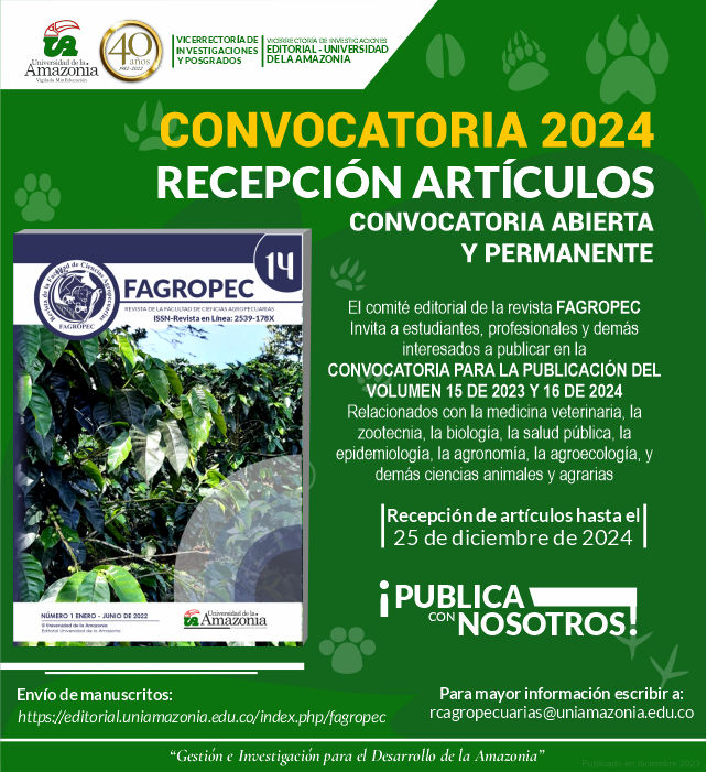El comité editorial de la Revista FAGROPEC de la Facultad de Ciencias Agropecuarias les invita a postular sus manuscritos de INVESTIGACIÓN CIENTÍFICA Y TECNOLÓGICA, REPORTE DE CASOS CLÍNICOS Y ARTÍCULOS DE REVISIÓN O REFLEXIÓN relacionados con estudios en Medicina Veterinaria, Zootecnia, Biología, Salud pública, Epidemiología, Agronomía, Agroecología, y demás Ciencias animales y agrarias.