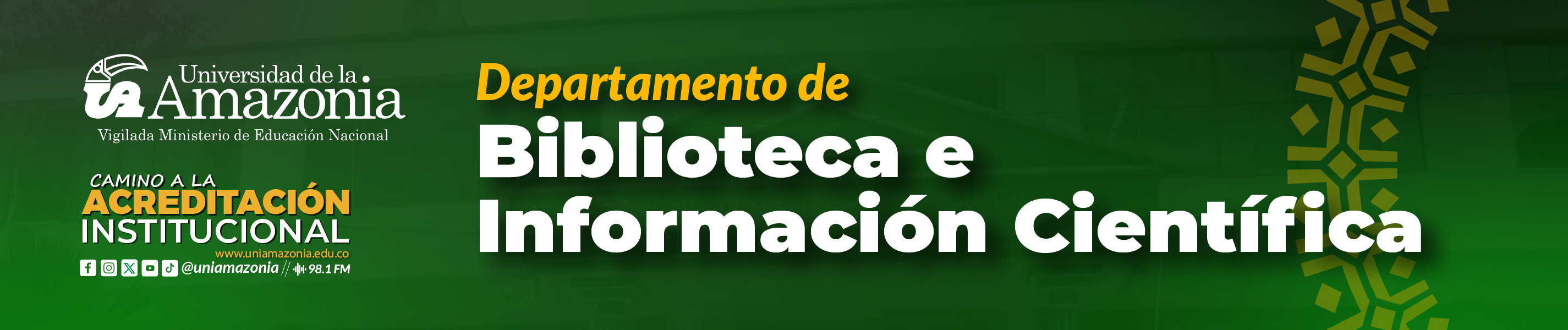 La División Biblioteca, adscrita a la Vicerrectoría de investigaciones y posgrados, cuenta con una Biblioteca Central ubicada en el Campus Porvenir, y tres más descentralizadas ubicadas en Biblioteca, Campus Centro, Granja Santo Domingo y Campus Leticia.
