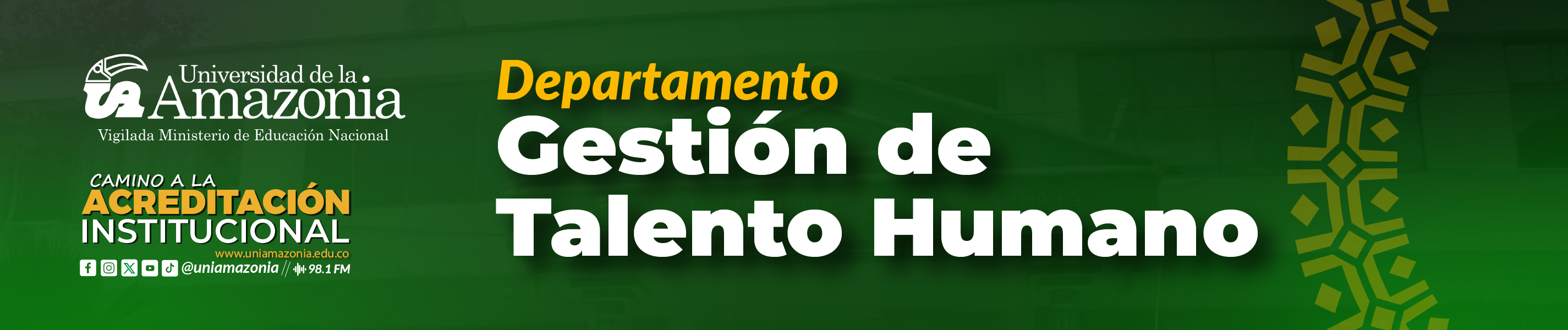 El Departamento Gestión de Talento Humano será una dependencia competitiva con capacidad de cambio continúo, que dispondrá de un talento humano cualificado, comprometido con la institución, con un nivel de autocontrol y gestión que garantizará la eficiencia y eficacia en los procesos internos, que redundará en beneficio del proyecto de universidad a que aspiramos las mujeres y hombres amazónicos de hoy y del mañana.