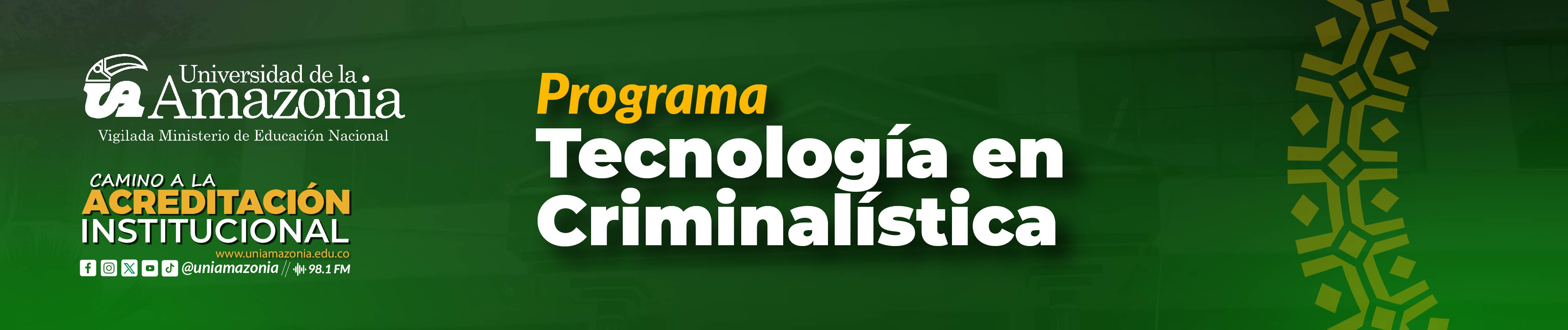 Infortunadamente en nuestra región los índices de violencia y criminalidad son muy elevados, debido, entre otras cosas, a la presencia de grupos armados al margen de la ley, el microtráfico, narcotráfico, delitos ecológicos, delincuencia común, etc.; es por esto por lo que la facultad de derecho y el programa de la tecnología en criminalística atendiendo a su estructura misional de “Formar Tecnólogos en Criminalística para apoyar la actividad judicial en términos de justicia material, fundamentada en el método técnico y científico, permitiendo el reconocimiento de la dignidad humana dentro del estado social y democrático de derecho” y visión en donde “El programa de Tecnología en Criminalística de la Universidad de la Amazonia será reconocido por formar tecnólogos a la vanguardia del método técnico y científico de la criminalística, que trasciendan hacia una visión global transformadora del conocimiento, útil para la búsqueda de la verdad y la justicia material”.