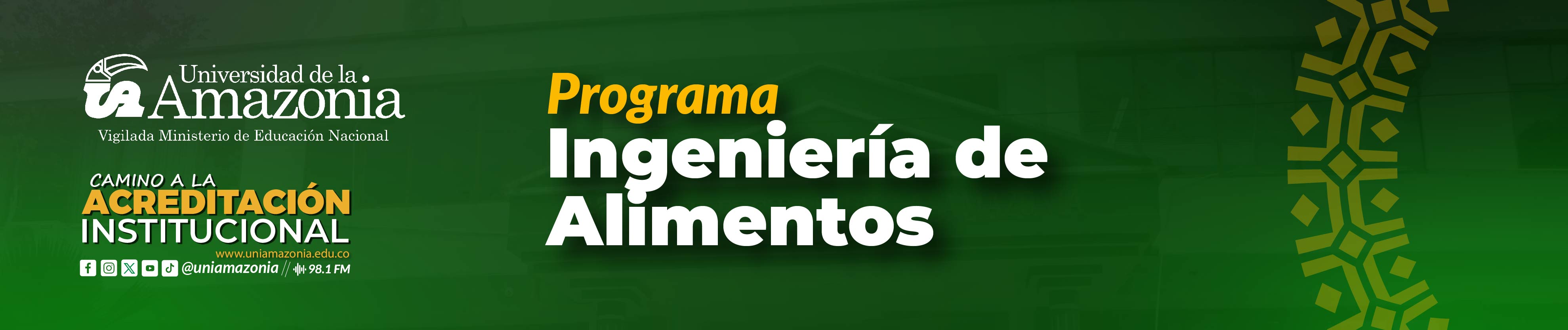 El programa de Ingeniería de Alimentos de la Universidad de la Amazonía está comprometido con la formación integral de profesionales, que fundamentados en el conocimiento y aplicación de los principios físicos, químicos, biológicos y de ingeniería, contribuyan especialmente al desarrollo de la Región Amazónica, dinamizando con criterios científicos y tecnológicos los procesos de generación, adaptación y transferencia de tecnologías propias de la Ingeniería de Alimentos, para asumir idóneamente los retos del futuro en materia de la seguridad alimentaria, y contribuir al mejoramiento de la calidad de vida de la sociedad.