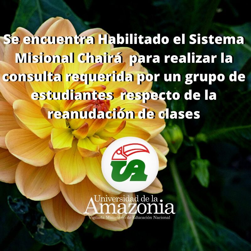 Con el fin de facilitar la generación de espacios de diálogo y participación al interior del estamento estudiantil de la Universidad de la Amazonia, se encuentra habilitado desde el día de hoy 03 de Diciembre de 2019 a las 12:00pm hasta el día de mañana 04/12/2019 hasta las 9:000pm, el Sistema Misional Chairá para la realización de la consulta requerida por un grupo de estudiantes.