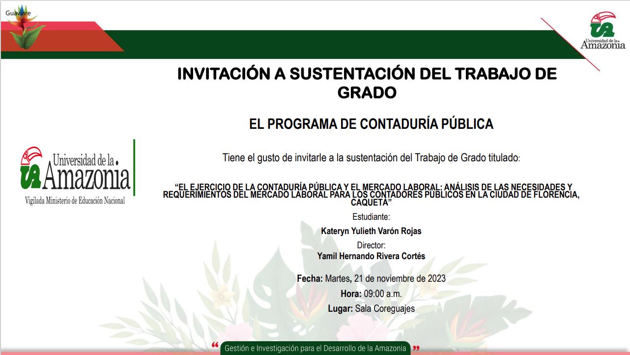 El Programa de Contaduría Pública tiene el gusto de invitarle a la socialización de la Pasantía, titulada “EL EJERCICIO DE LA CONTADURÍA PÚBLICA Y EL MERCADO LABORAL: ANÁLISIS DE LAS NECESIDADES Y REQUERIMIENTOS DEL MERCADO LABORAL PARA LOS CONTADORES PÚBLICOS EN LA CIUDAD DE FLORENCIA, CAQUETÁ”.
