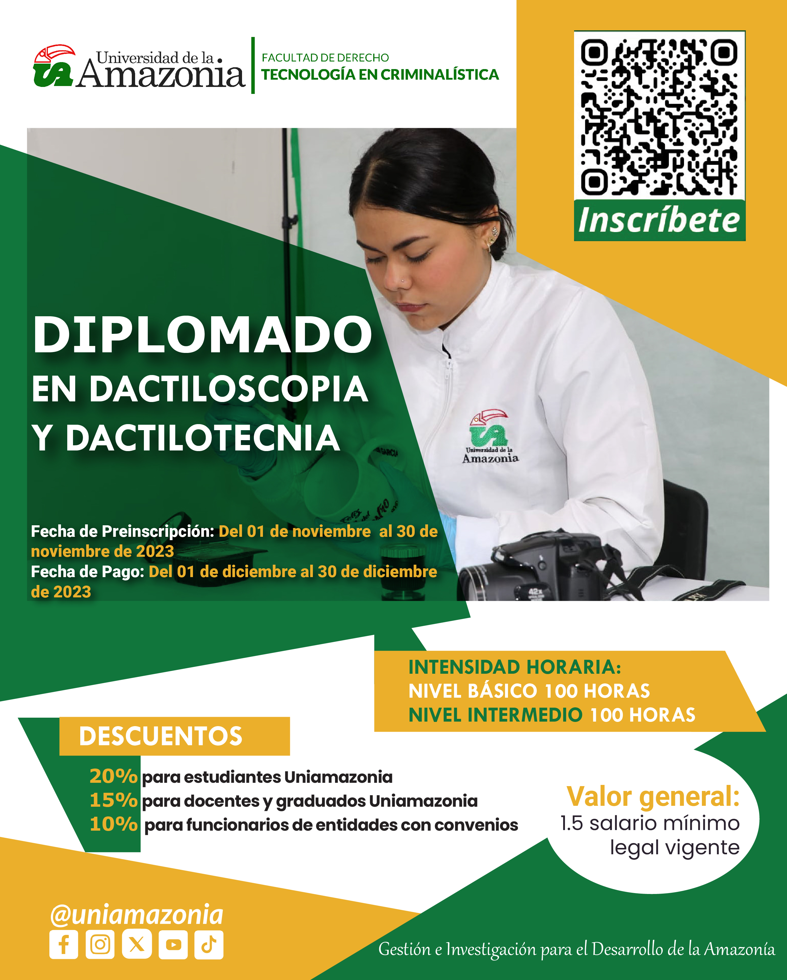 El programa Tecnología en Criminalística y la Facultad de Derecho de la Universidad de la Amazonia, oferta el Diplomado en Dactiloscopia y Dactilotecnia bajo la modalidad Distancia (Presencial y mediación del proceso a través de plataformas tecnológicas).