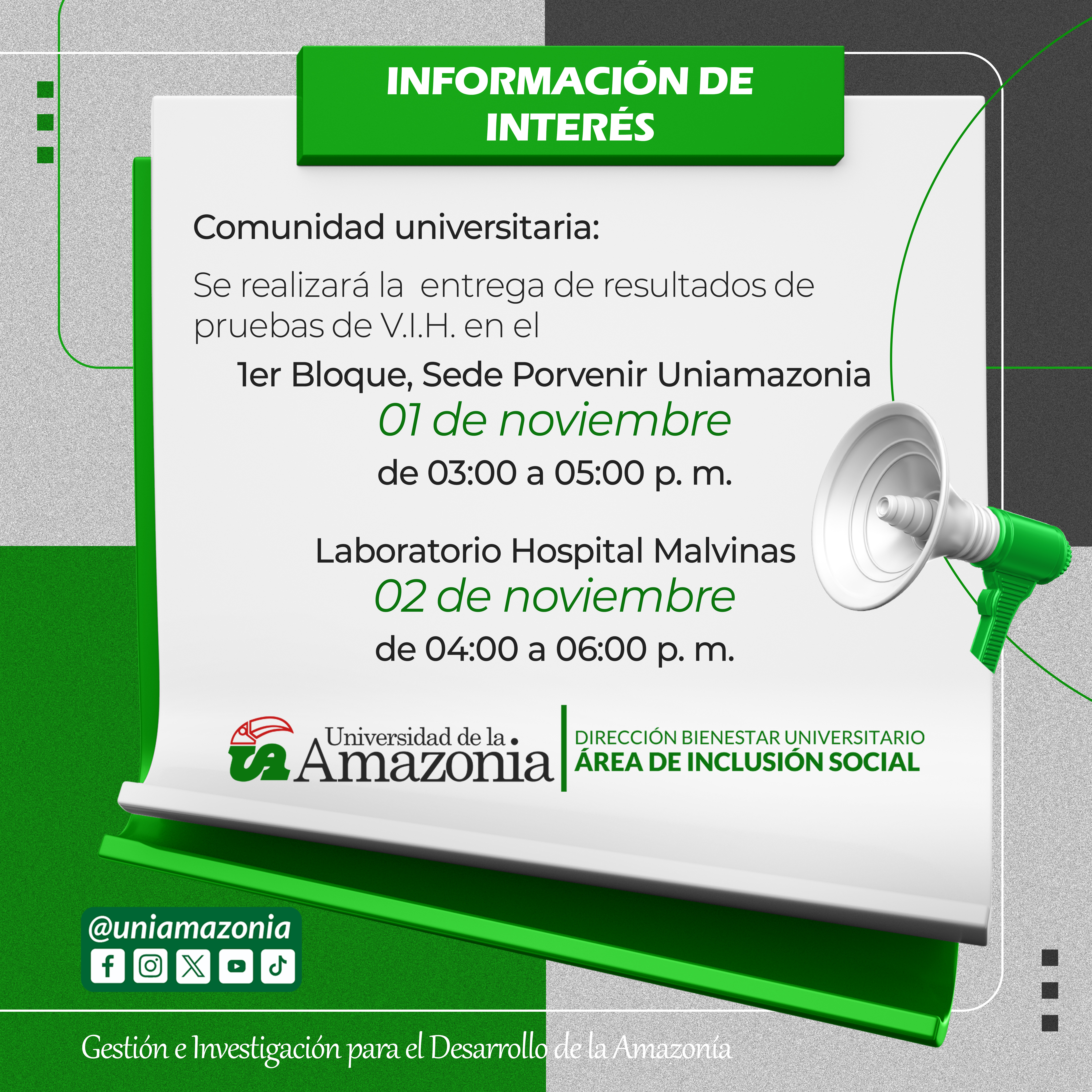 La Universidad de la Amazonia, desde la dirección de bienestar Universitario, invita a la comunidad académica, administrativa y público en general, a la entrega de resultados de las muestras de VIH, HEPATITIS B Y HEPATITIS C tomadas en la jornada de salud los días 25 y 25 de octubre.