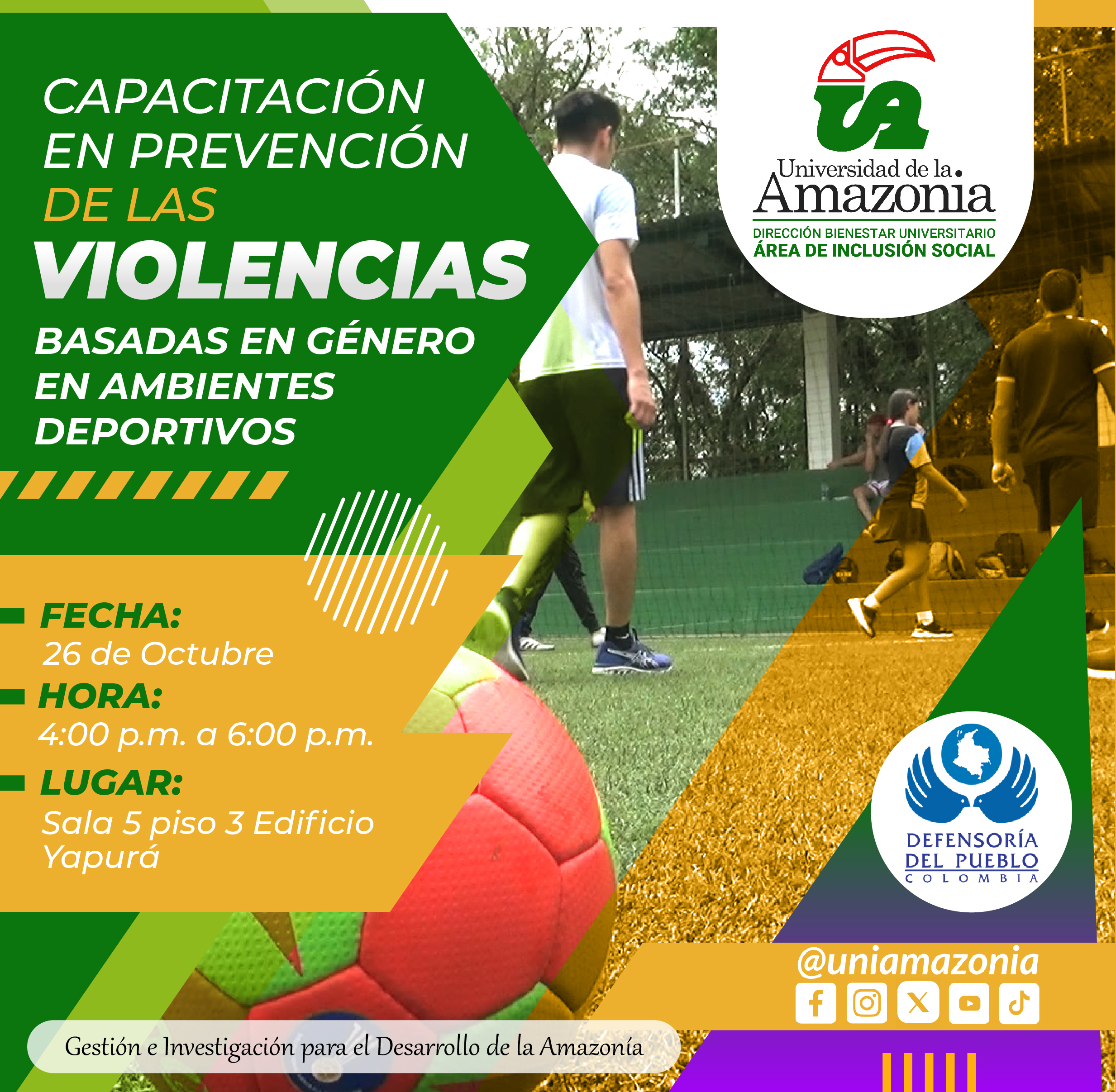 Desde la Dirección de Bienestar Universitario, el Área de Inclusión Social en apoyo de la Defensoría del Pueblo, hace extensiva la invitación a la Comunidad Universitaria para que participe en la " Capacitación en prevención de las violencias basadas en género en ambientes deportivos".