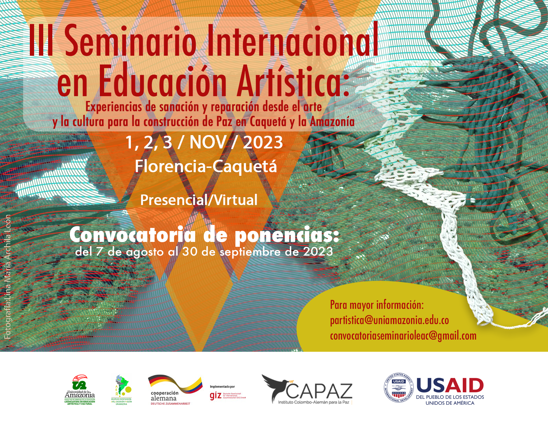 Es un espacio para la interacción y visibilización de procesos artísticos, culturales comunitarios y pedagógicos en el territorio geográfico, biofísico, político y cultural de la región amazónica. Desde una metodología participativa, el III SEMINARIO INTERNACIONAL EN EDUCACIÓN ARTÍSTICA: Experiencias de sanación desde el arte y la cultura para la construcción de paz en Caquetá y la Amazonia, pretende posibilitar la interrelación de diferentes experiencias desde la proximidad del encuentro ancestral, sanador, reparador y académico de puerta abierta a la sociedad, fortaleciendo procesos de gobernanza e incidencia en el contexto local, regional, nacional e internacional. Así mismo, se pretende adquirir cohesión y sincronía con los procesos de otras instituciones y agentes educativos.