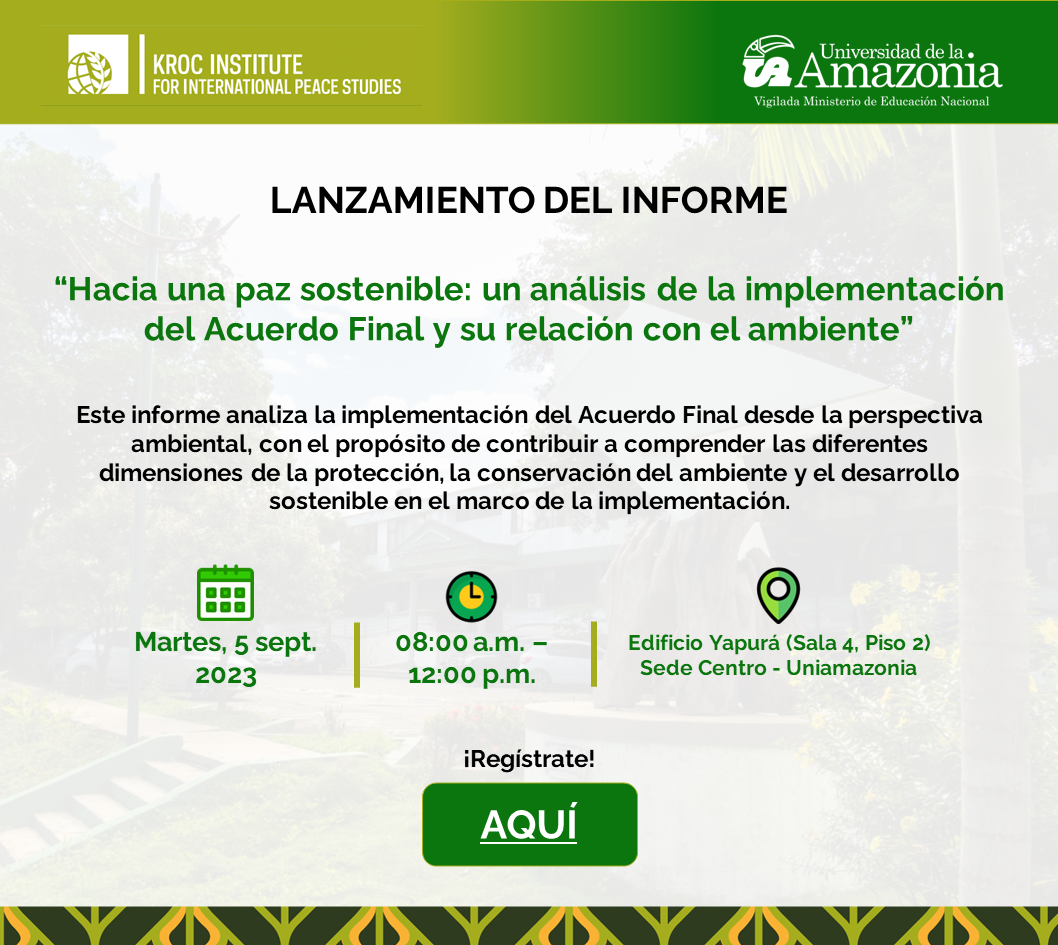 De manera cordial los y las invitamos a la socialización del informe “Hacia una paz sostenible: un análisis de la implementación del Acuerdo Final y su relación con el ambiente” realizado por el Instituto Kroc para comprender las dimensiones de la protección, la conservación del ambiente y el desarrollo sostenible en el marco de la implementación del Acuerdo Final de Paz.