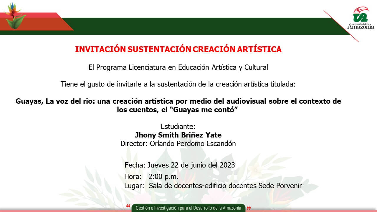 El Programa Licenciatura en Educación Artística y Cultural tiene el gusto de invitarlos a la sustentación de la creación artística titulada: Guayas, La voz del rio: una creación artística por medio del audiovisual sobre el contexto de los cuentos, el “Guayas me contó”.