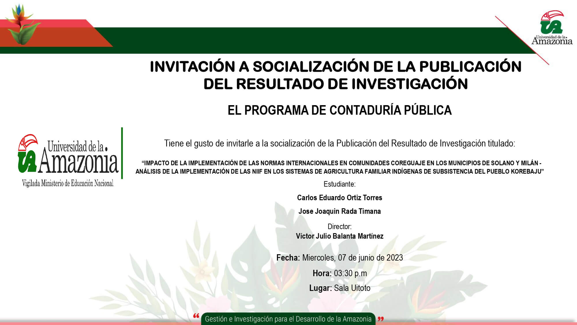El Programa de Contaduría Pública tiene el gusto de invitarle a la socialización de la Publicación del Resultado de Investigación, titulado “IMPACTO DE LA IMPLEMENTACIÓN DE LAS NORMAS INTERNACIONALES EN COMUNIDADES COREGUAJE EN LOS MUNICIPIOS DE SOLANO Y MILÁN - ANÁLISIS DE LA IMPLEMENTACIÓN DE LAS NIIF EN LOS SISTEMAS DE AGRICULTURA FAMILIAR INDÍGENAS DE SUBSISTENCIA DEL PUEBLO KOREBAJU”.