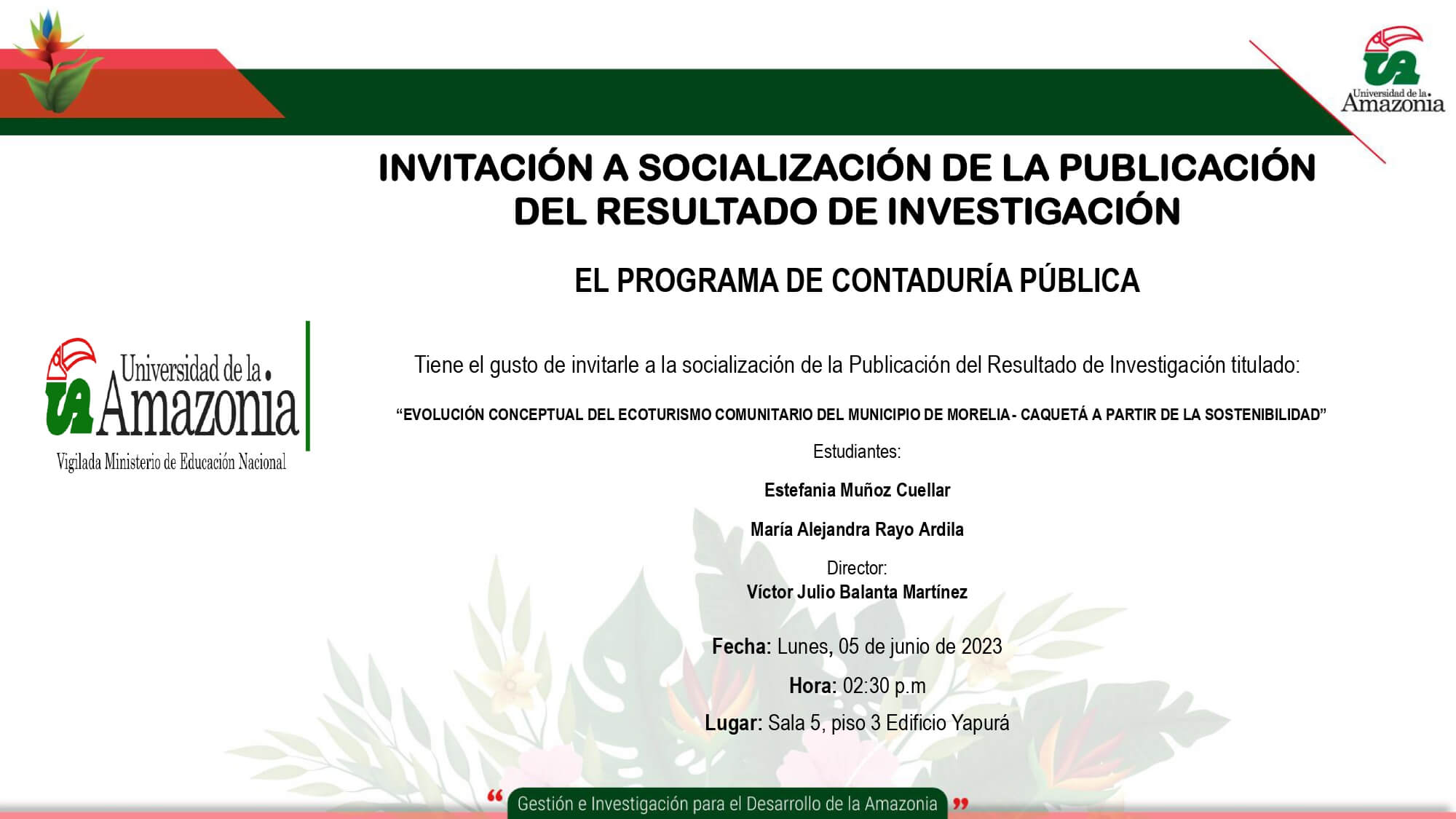 El Programa de Contaduría Pública tiene el gusto de invitarle a la socialización de la Publicación del Resultado de Investigación, titulado “EVOLUCIÓN CONCEPTUAL DEL ECOTURISMO COMUNITARIO DEL MUNICIPIO DE MORELIA - CAQUETÁ A PARTIR DE LA SOSTENIBILIDAD”.