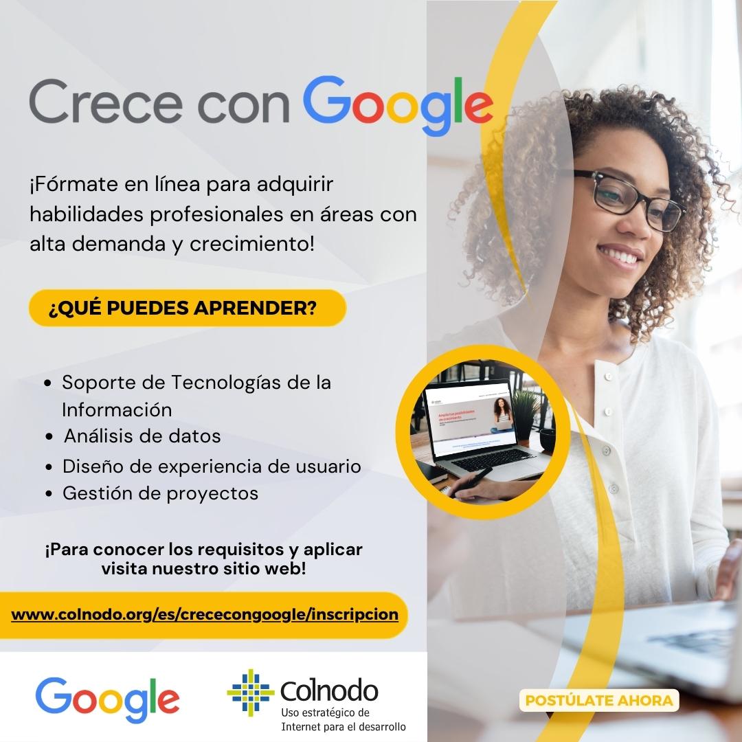 Objeto: Crece con Google es una iniciativa que busca fortalecer habilidades digitales de alta demanda para ampliar las oportunidades de inclusión laboral en Colombia a través de los Certificados de Carrera de Google.