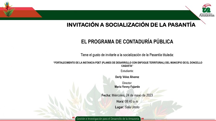 - El Programa de Contaduría Pública tiene el gusto de invitarle a la socialización de la Pasantía, titulada “FORTALECMIENTO DE LA INSTANCIA PDET (PLANES DE DESARROLLO CON ENFOQUE TERRITORIAL) DEL MUNICIPIO DE EL DONCELLO CAQUETA”.