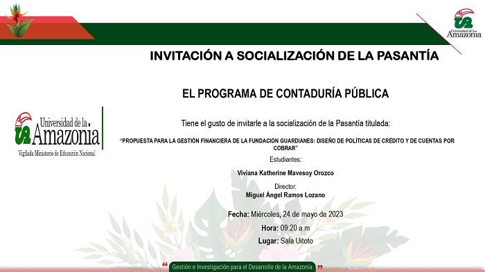 El Programa de Contaduría Pública tiene el gusto de invitarle a la socialización de la Pasantía, titulada “PROPUESTA PARA LA GESTIÓN FINANCIERA DE LA FUNDACIÓN GUARDIANES: DISEÑO DE POLÍTICAS DE CRÉDITO Y DE CUENTAS POR COBRAR”.