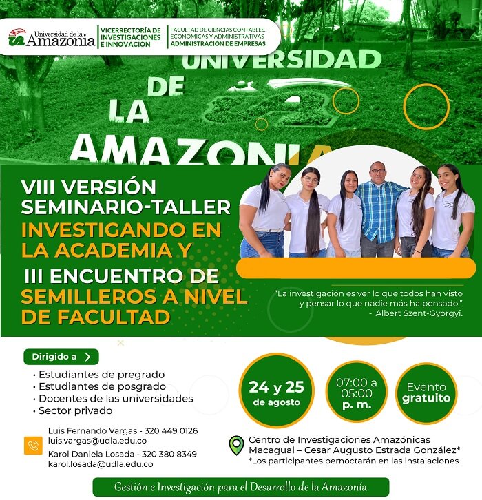 La Vicerrectoría de Investigaciones e Innovación y el semillero de investigación en finanzas “SIFIN” adscrito al programa de Administración de Empresas de la Universidad de la Amazonia, hace extensiva la invitación a los semilleros activos en la plataforma del sistema para la gestión de los proyectos de investigación “SIGEPI”, pertenecientes a la facultad de Ciencias Contables, Económicas y Administrativas a participar en la VIII versión del Seminario-Taller Investigando en la Academia y Tercer encuentro de Semilleros Interno a Nivel de Facultad los días 24 y 25 de agosto de 2023 en el horario de 07:00 am a 05:00 pm en el Centro de Investigaciones Amazónicas Macagual – César Augusto Estrada González de la Universidad de la Amazonia.