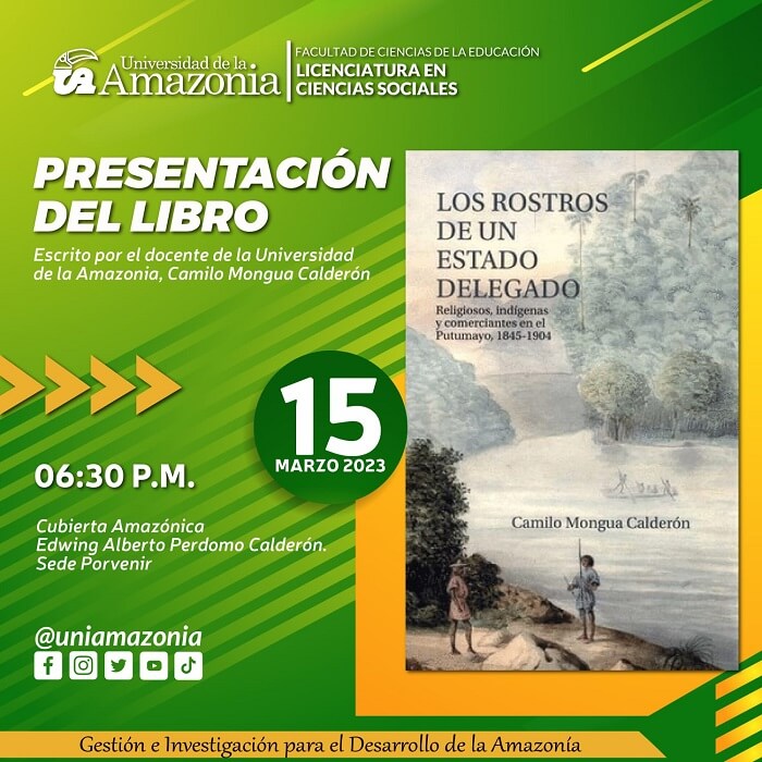 La Licenciatura en Ciencias Sociales de la Universidad de la Amazonia invita a la presentación del libro: Los rostros de un Estado delegado, religiosos, indígenas y comerciantes en el Putumayo 1845-1904, escrito por el docente Dr. Camilo Mongua Calderón.