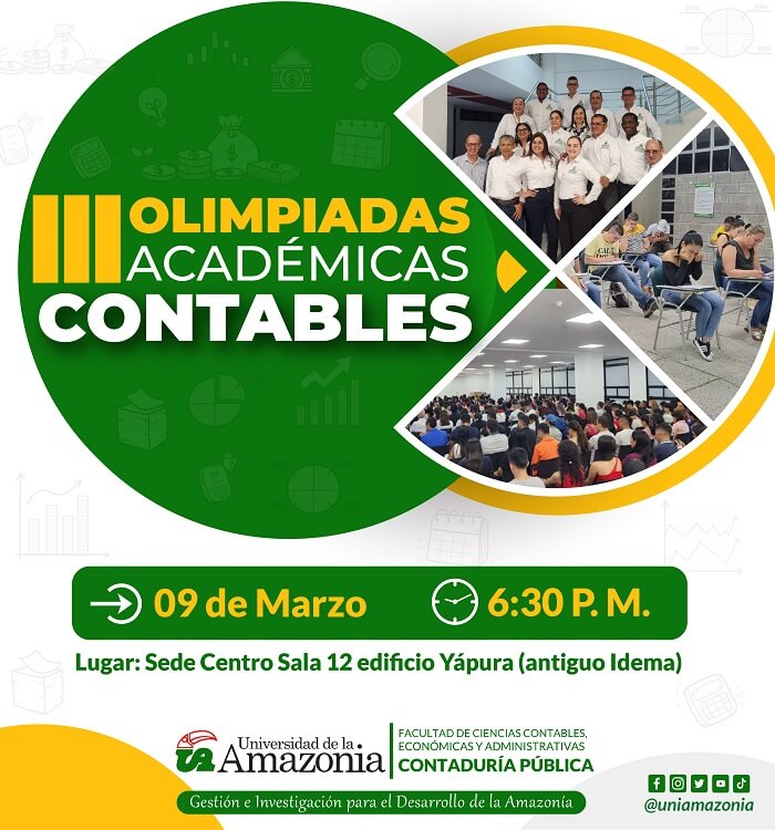 El Programa de Contaduría Pública de la Universidad de la Amazonía, tiene el gusto de invitar a todos los estudiantes del Programa, a participar de las Olimpiadas Académicas, que se realizará hoy, 09 de marzo del 2023, en el Edificio Yapurá (Sala 12-Sede Centro), a partir de las 6:30 pm, llevar dispositivo con conexión a internet.