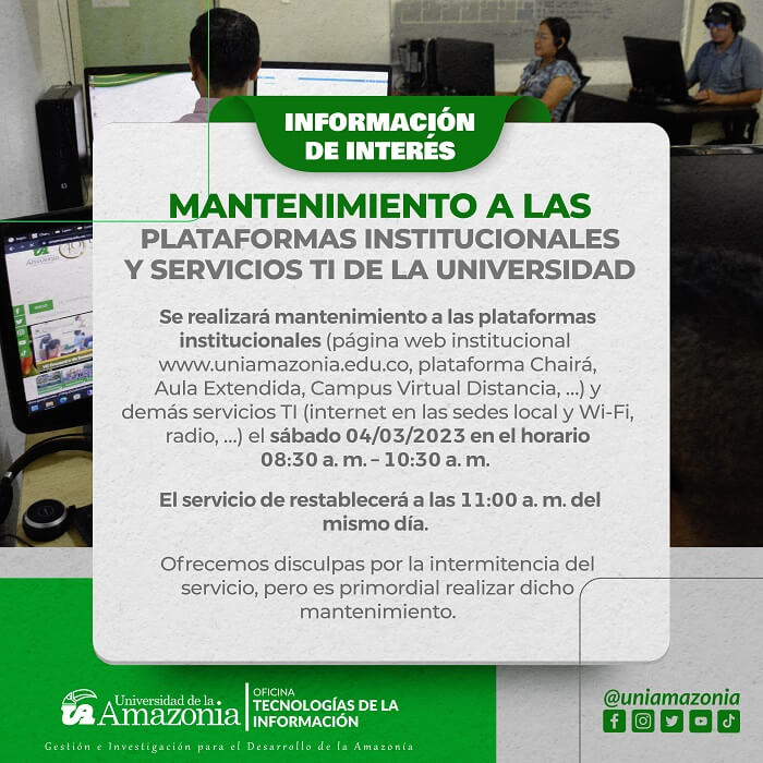 Informamos a nuestra comunidad académica que el día 04/03/2023 en el horario 08:30 a. m. - 10:30 a. m. no tendremos servicio en nuestras plataformas institucionales y servicios TI en la Universidad de la Amazonia, debido a un mantenimiento programado.