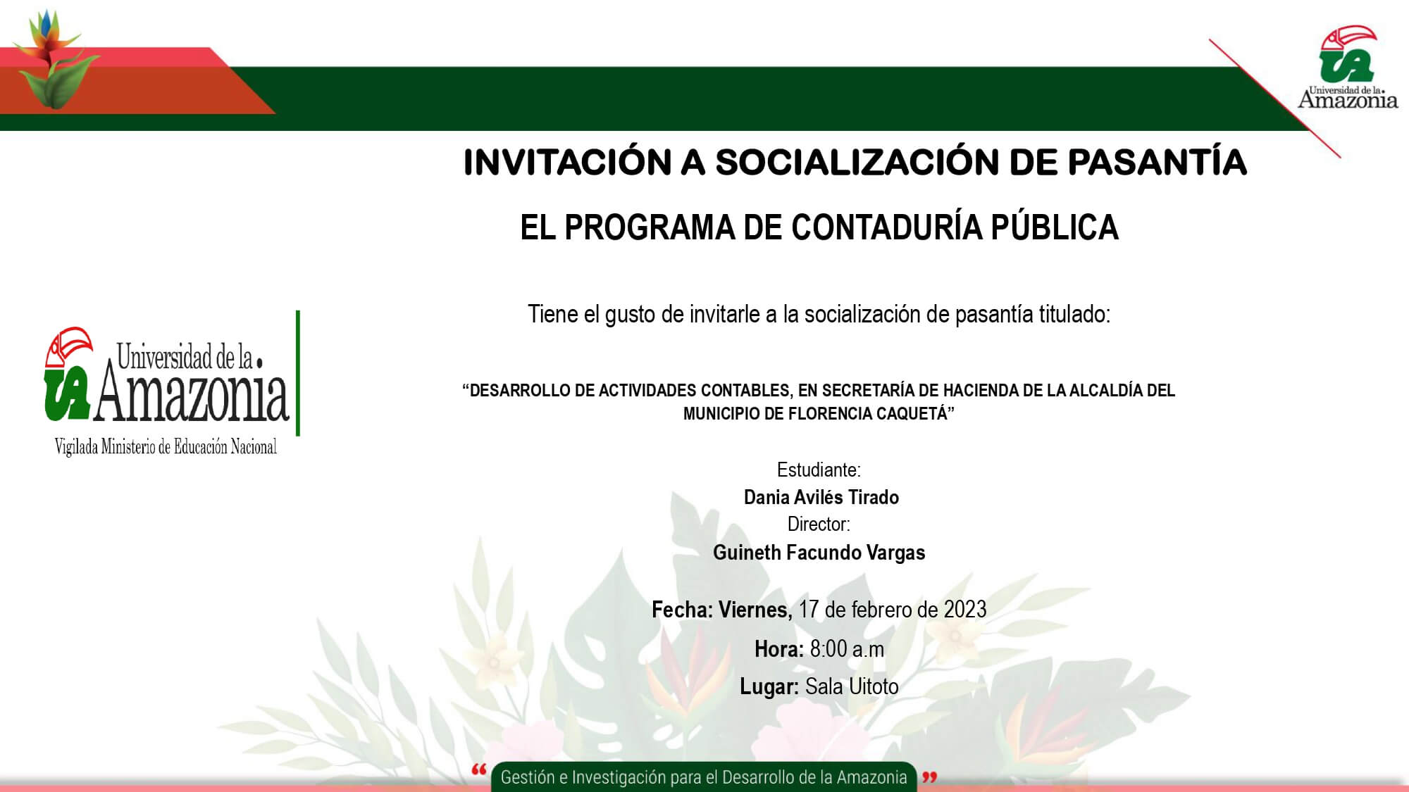 El Programa de Contaduría Pública: Tiene el gusto de invitarle a la socialización de la Pasantía titulada Desarrollo de actividades contables, en Secretaría de Hacienda de la Alcaldía del municipio de Florencia Caquetá.