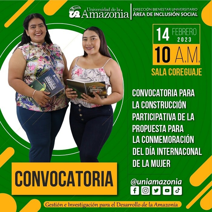 La Universidad de la Amazonia, desde la División de Bienestar Universitario y el Área de Inclusión Social dando cumplimiento a la estrategia “Uniamazonia libre de discriminación”, da a conocer a la comunidad universitaria la Convocatoria “Convocatoria para la construcción participativa de la propuesta para la conmemoración del día de la Mujer” la cual se encuentra a cargo del Area de Inclusión Social, a cargo de su coordinadora Karol Garcia Barreto.
