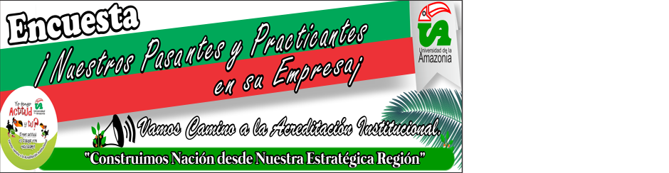 La Oficina de Relaciones Interinstitucionales hace extensiva la invitación a los empresarios de la región a realizar la siguiente encuesta que tiene como finalidad recolectar datos importantes para realizar un diagnóstico sobre el desempeño de los pasantes y practicantes de la Universidad de la Amazonia. En virtud a lo anterior, se le agradecerá de forma muy especial su colaboración para responder las preguntas que encontrará a continuación. No está demás enfatizar que los datos que usted exponga, serán tratados con profesionalismo, discreción y responsabilidad.