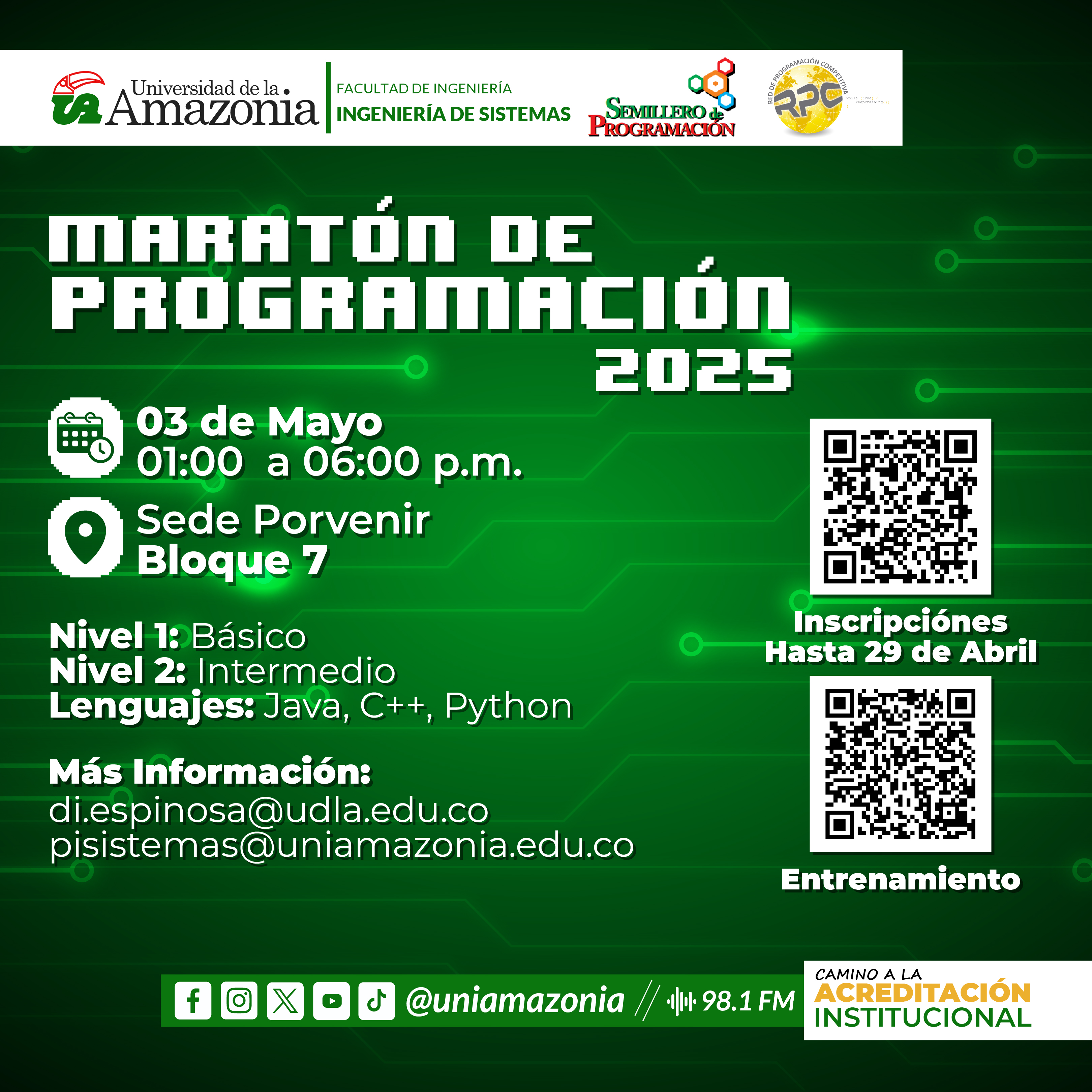 El Semillero de Programación perteneciente al Programa de Ingeniería de Sistemas de la Universidad de la Amazonia, se complace en invitar a la comunidad universitaria a la Maratón de Programación 2025 que se llevará a cabo: