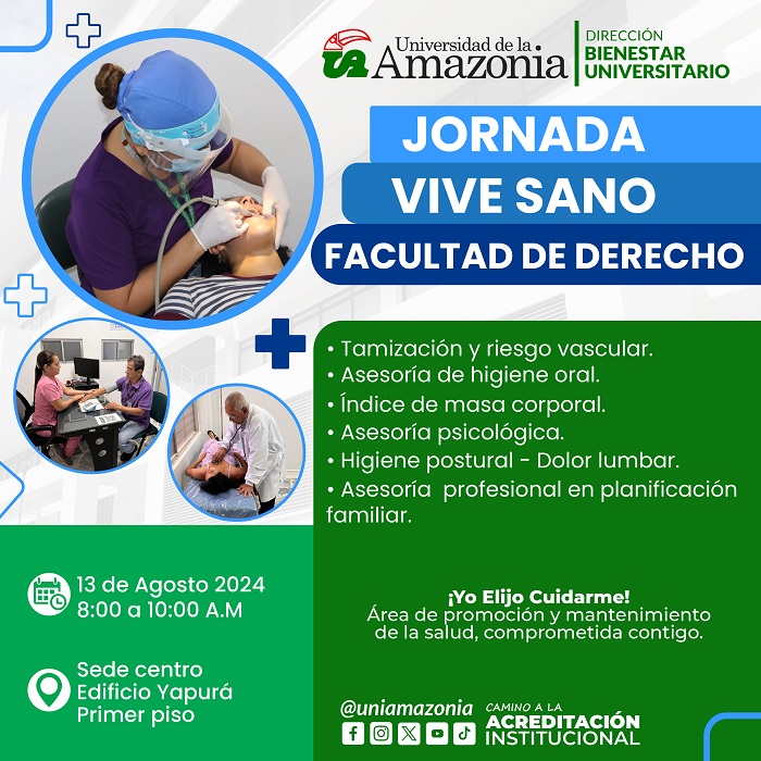 Invitacion a la Comunidad Universitaria que pertenezca a la Facultad de derecho a participar de la jornada UNIAMAZONIA – VIVE SANO. Donde se llevará a cabo: