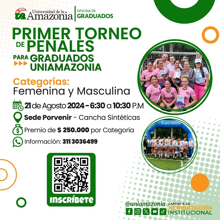 Graduado, Ven e Intégrate con tu familia Uniamazonia, en este Primer Torneo De Penales Para Graduados, Categoría Femenina y Masculino, el cual se llevara acabo el día 21 de agosto del 2024, en la sede porvenir a partir de las las 6:30 pm