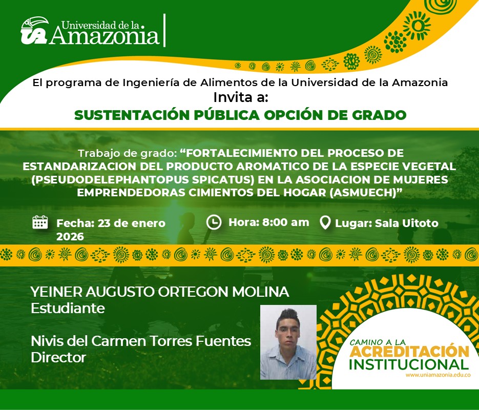 La Universidad de la Amazonia, a través del Programa de Ingeniería de Alimentos, tiene el gusto de invitar a la comunidad universitaria y al público en general a la socialización pública de la opción de grado: