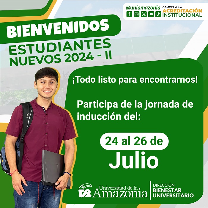 - Del miércoles 24 al viernes 26 de julio, inducción para estudiantes de pregrado presencial jornada diurna y nocturna. "Uniamazonia transforma tu camino hacia el conocimiento y crecimiento personal"