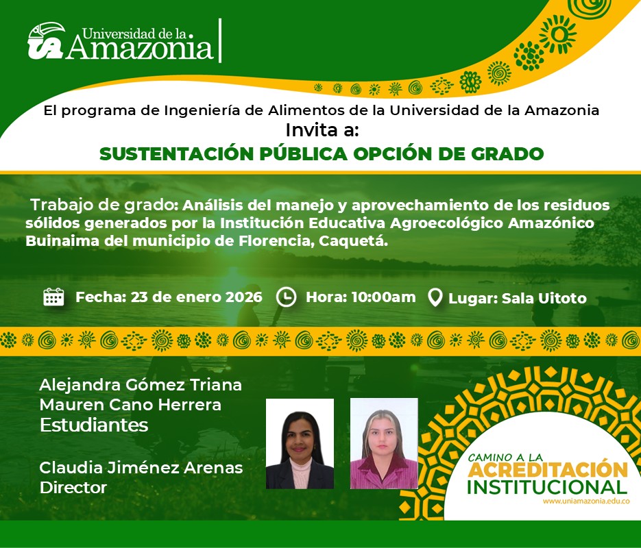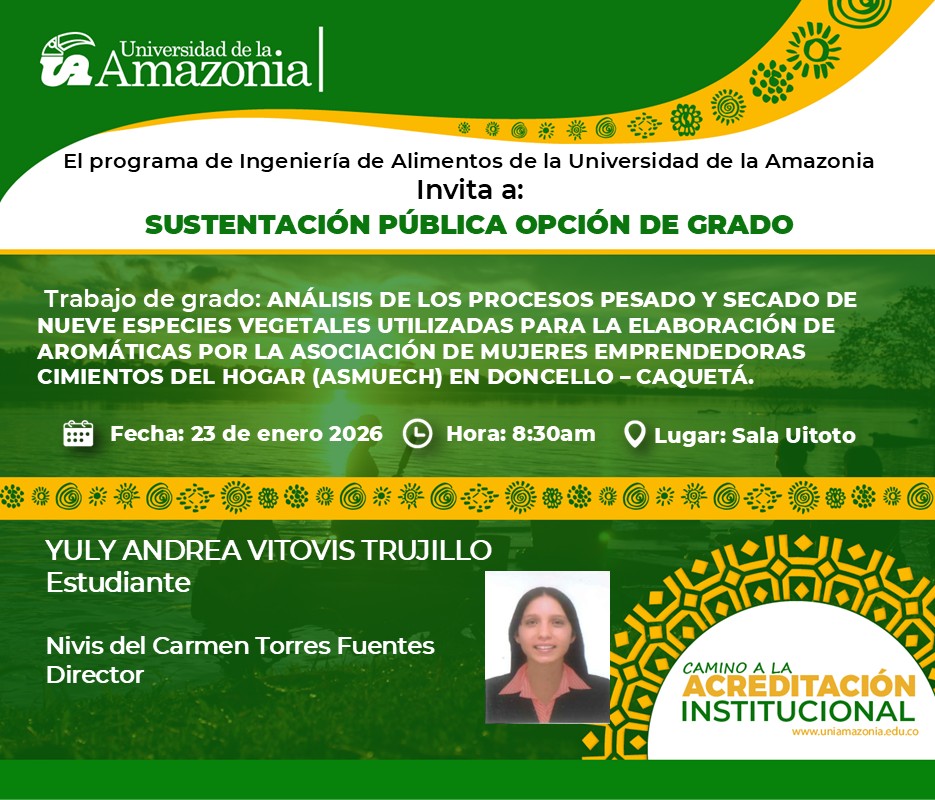 La Universidad de la Amazonia, a través del Programa de Ingeniería de Alimentos, tiene el gusto de invitar a la comunidad universitaria y al público en general a la socialización pública de la opción de grado: