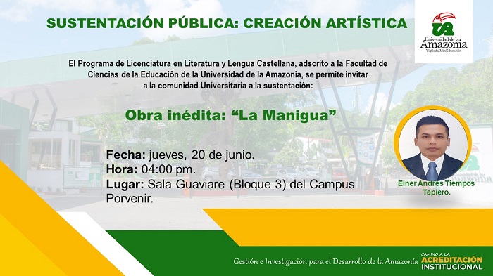 Desde la Licenciatura en Literatura y Lengua Castellana, hacemos extensiva la invitación para que participen de la sustentación de la opción de grado bajo la modalidad de creación artística con la obra inédita: La Manigua, del estudiante Einer Andres Tiempos Tapiero.