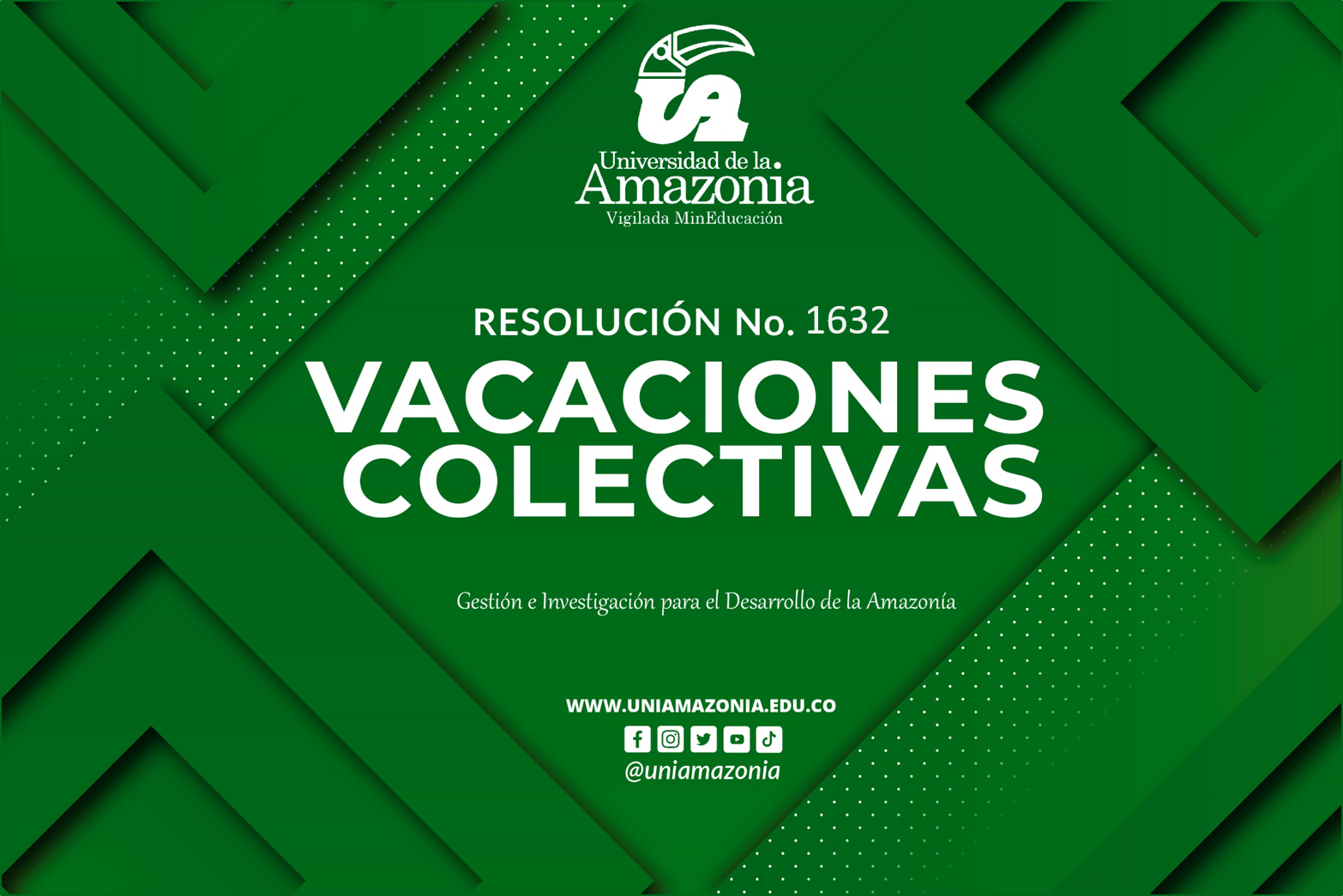 La División de Servicios Administrativos de la Universidad de la Amazonia, da a conocer la Resolución No. 1632 del 05 de junio del 2024 a través de la cual se conceden vacaciones colectivas al personal docente de planta de la Universidad de la Amazonia.