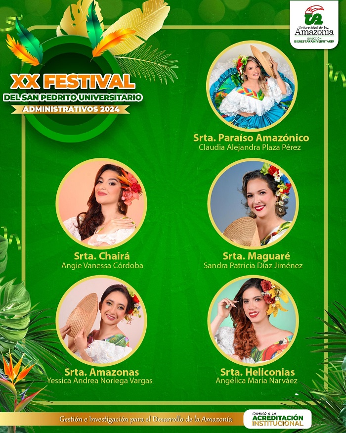 La Universidad de la Amazonia presenta a las señoritas Paraíso Amazónico, Chairá, Maguaré, Amazonas y Heliconias quienes participarán del XX Festival de San Pedrito Universitario Docentes Administrativos 2024.