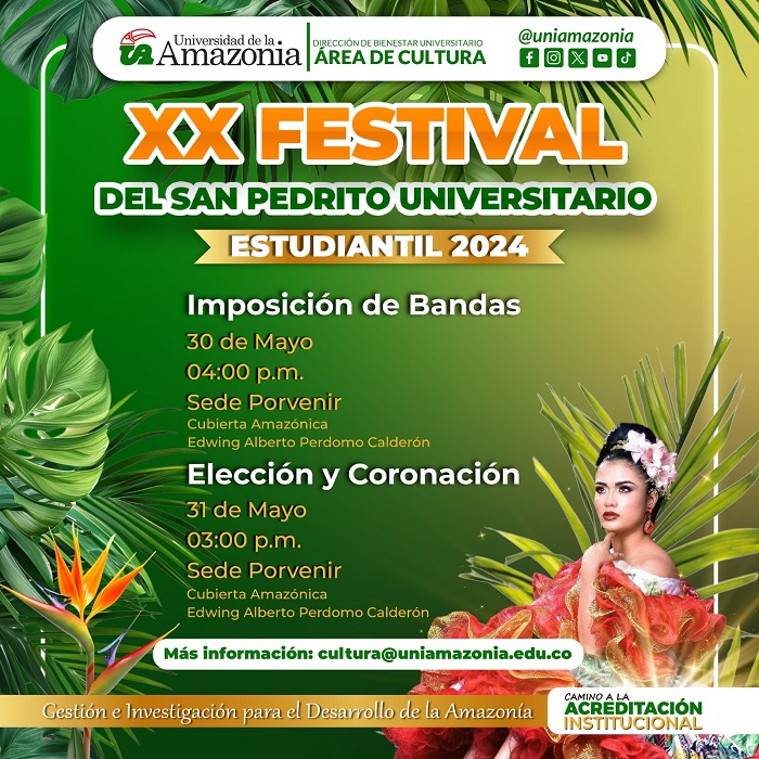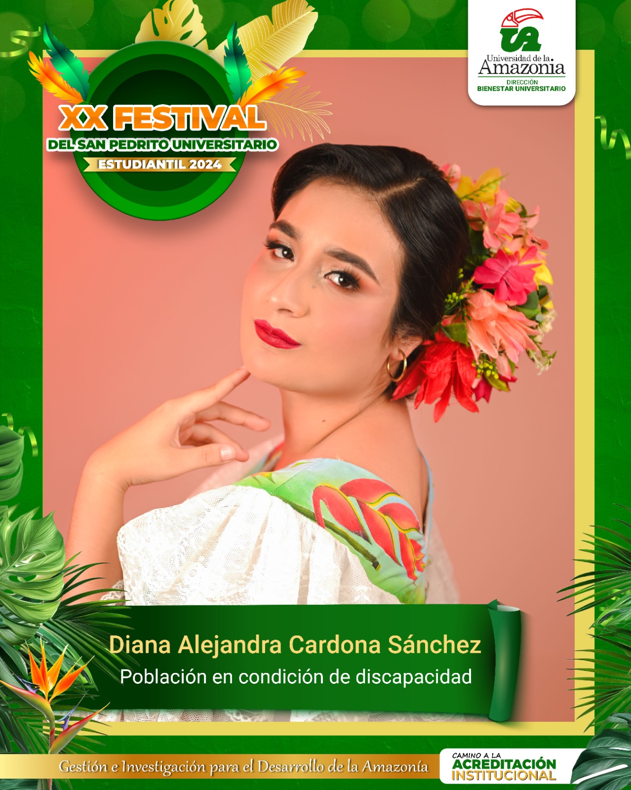 La Universidad de la Amazonia presenta a la señorita representante de la Población en condición de Discapacidad, Diana Alejandra Cardona Sánchez y a su Parejo Oscar Alejandro Galindo Oliveros quienes participaran del XX Festival de San Pedrito Universitario Estudiantil 2024.