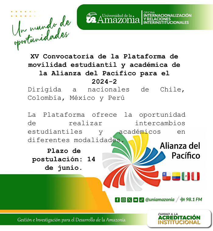 Se encuentra abierta la XV Convocatoria de la Plataforma de Movilidad Estudiantil y Académica de la Alianza del Pacífico para el segundo periodo académico 2024.