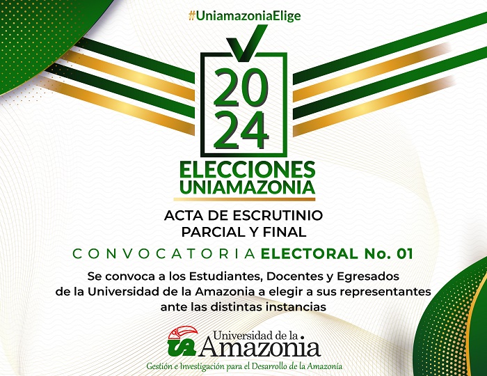 En las instalaciones de la Sede Principal de la Universidad de la Amazonia en la Cubierta Amazónica Edwing Alberto Perdomo Calderón, hoy 03 de mayo de 2024, siendo las 9:22 p.m. hora oficial colombiana, el Consejo Electoral se constituye en audiencia pública para realizar el acta de escrutinio final de la jornada de elección de los Representantes de los docentes, estudiantes y egresados ante las diferentes instancias de la Universidad de la Amazonia, habilitados en la Convocatoria Electoral No. 01 de 2024, Convocada por la Resolución Rectoral de 2024.