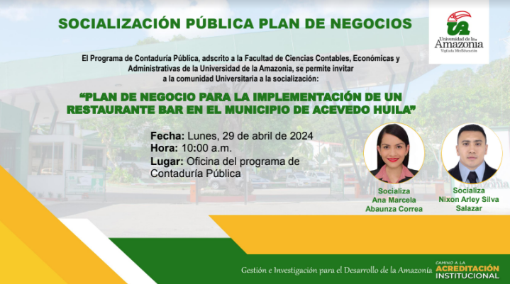 Programa de Contaduría Pública Tiene el gusto de invitarle a la socialización del Plan de Negocios, titulado “PLAN DE NEGOCIO PARA LA IMPLEMENTACIÓN DE UN RESTAURANTE BAR EN EL MUNICIPIO DE ACEVEDO HUILA”.