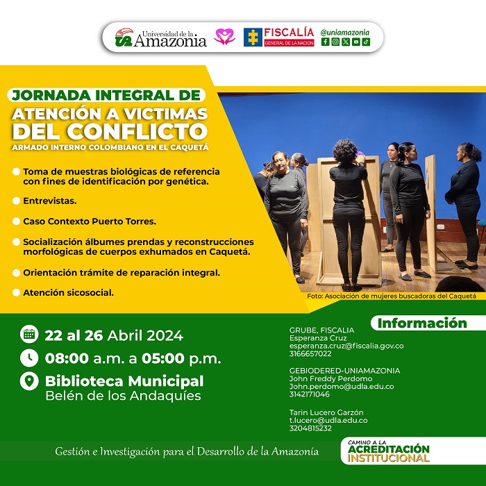El grupo de Extensión y Proyección social GEBIODERED de la Universidad de la Amazonia invita a la comunidad académica y general a la Jornada de atención integral a Victimas a realizarse desde el despacho 243 del Grupo de búsqueda, identificación y entrega de personas desaparecidas de la dirección de Justicia transicional de la Fiscalía General de la Nación, con el apoyo de la sociedad alemana de cooperación internacional GIZ. Belén de los Andaquíes 21-26 de abril de 2024.
