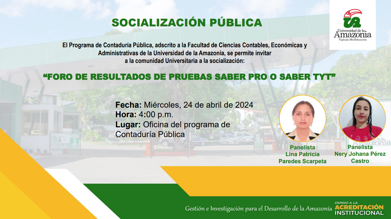 Programa de Contaduría Pública tiene el gusto de invitarle a la sustentación del Trabajo de Grado, titulada “FORO DE SOCIALIZACIÓN DE LOS RESULTADOS DE PRUEBAS SABER PRO O SABER TYT, OPCIÓN DE GRADO.”