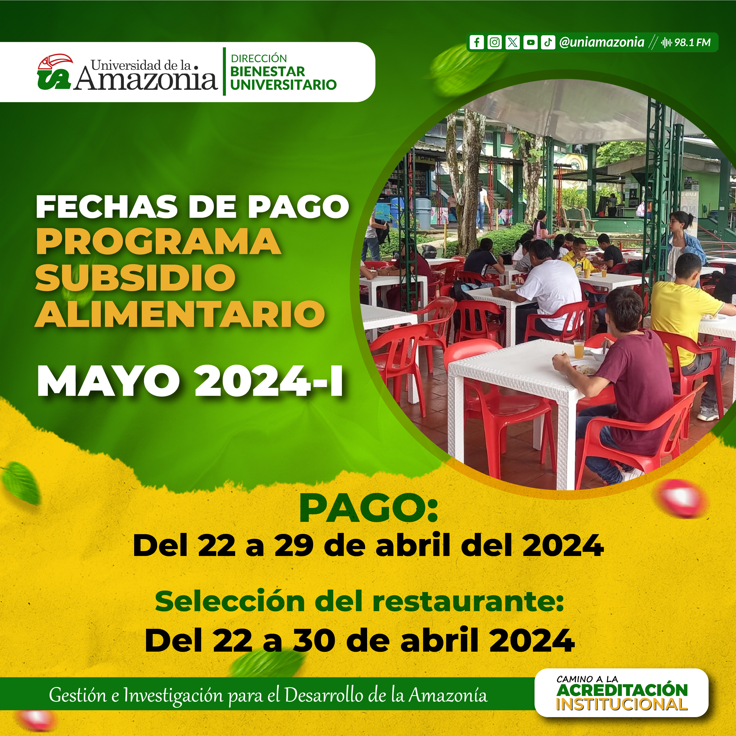 La Universidad de la Amazonia desde la Dirección de Bienestar Universitario área de Promoción y Apoyo Socioeconómico, informa a los estudiantes beneficiarios del programa subsidio alimentario, que se encuentra habilitada la plataforma Chairá para realizar el pago y posterior selección de restaurante para el mes de abril.