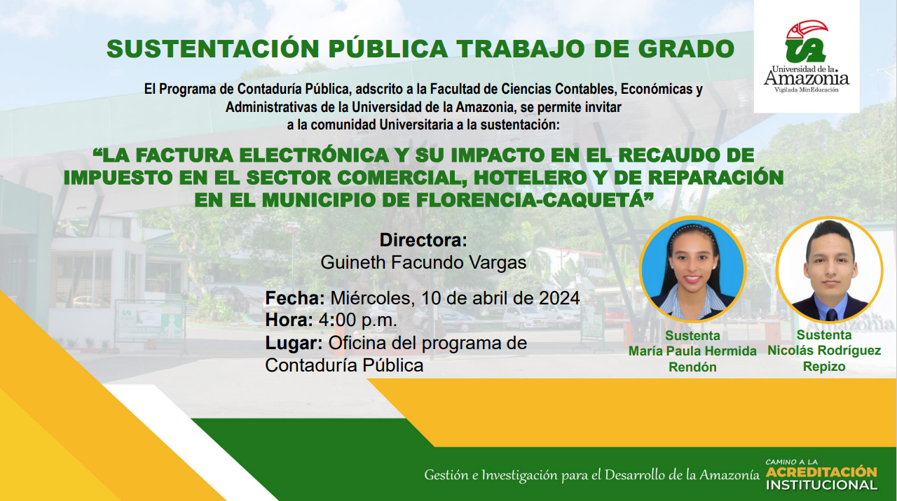 Programa de Contaduría Pública tiene el gusto de invitarle a la sustentación del Trabajo de Grado, titulada “LA FACTURA ELECTRÓNICA Y SU IMPACTO EN EL RECAUDO DE IMPUESTO EN EL SECTOR COMERCIAL, HOTELERO Y DE REPARACIÓN EN EL MUNICIPIO DE FLORENCIA-CAQUETÁ”